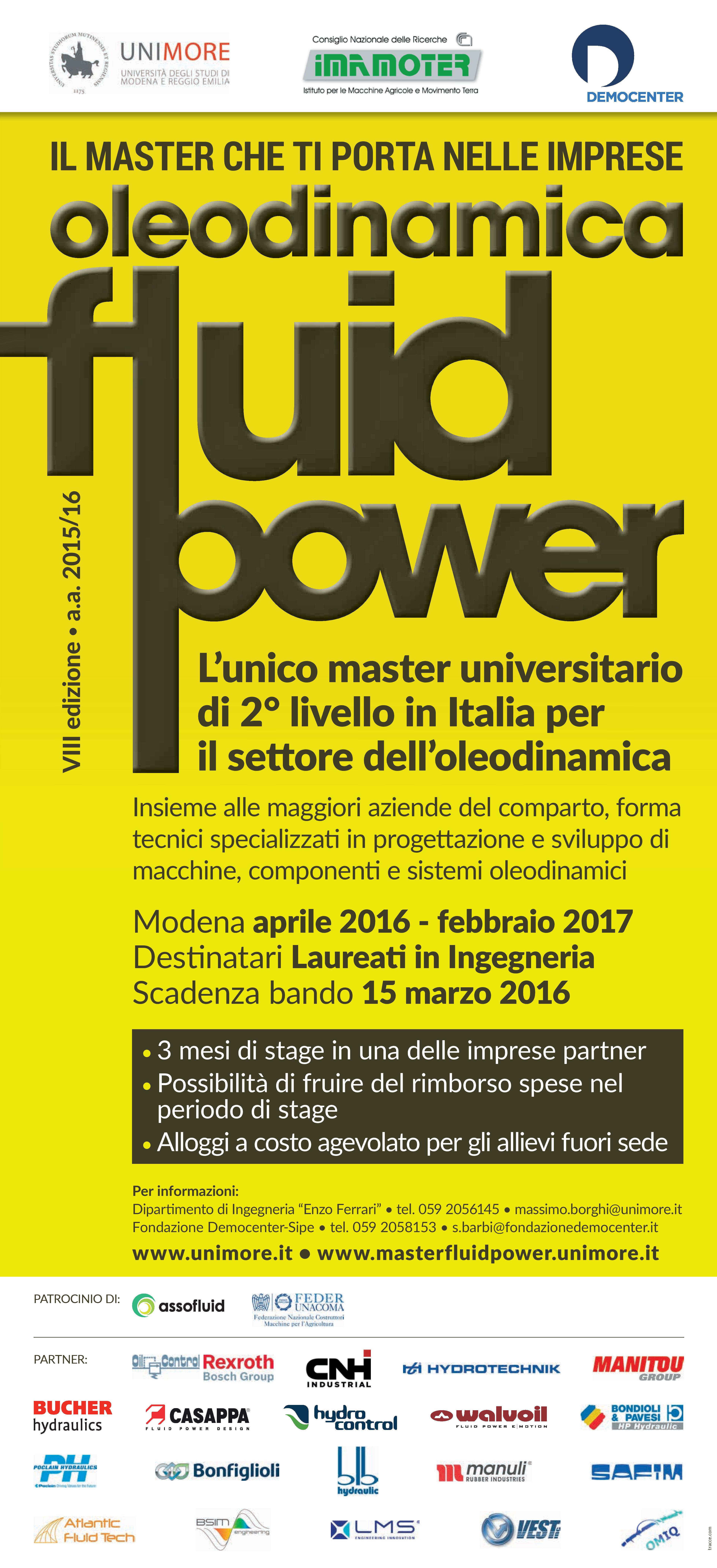 Le FinalitàIl Master intende formare una figura professionale con elevate conoscenze e competenze tecnico-specialistiche inerenti la progettazione, sperimentazione, ricerca e sviluppo di macchine, componenti e sistemi oleodinamici per la trasmissione di potenza via fluido, con particolare attenzione all'utilizzo dell'elettronica.Tale figura è molto ricercata dalle imprese del settore oleodinamico (produttrici di componenti e sistemi oleoidraulici ), ma anche dagli utilizzatori di componenti oleodinamici quali i produttori di macchine mobili(macchine agricole, macchine edili, di movimentazione materiali, auto e veicoli in genere) e di macchine fisse e speciali (presse idrauliche, macchine automatiche per il confezionamento, impianti eolici, piattaforme marine, simulatori di volo ecc.) All'interno di un'impresa si inserisce nelle aree di: